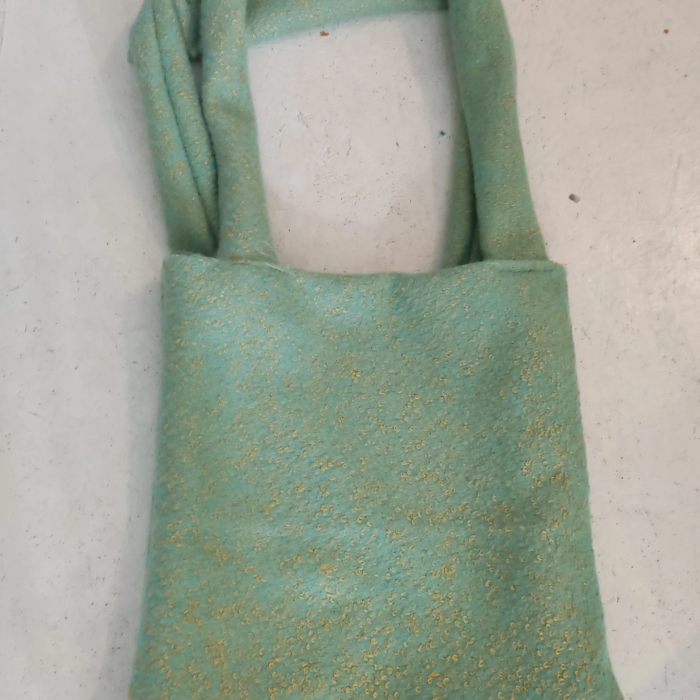 Mintgroene wol, met kleine gouden spikkeltjes die subtiel het licht vangen.